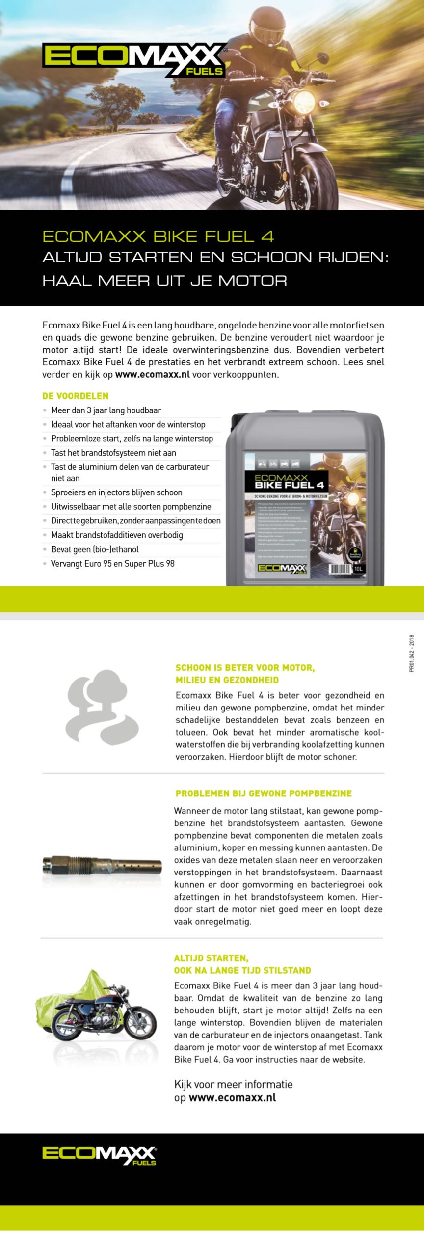DOOR DE STEEDS HARDNEKKIGER WORDEN VAN DE PROBLEMEN MET DE HEDENDAAGS BENZINE SOORTEN,ZIJN WIJ GESTART MET DE VERKOOP VAN ECOMAXX BENZINE. DEZE BENZINE IS UITERMATE GESCHIKT VOOR HET LATEN OVERWINTEREN VAN UW MOTORFIETS  OF VOOR HETGEBRUIK IN OLDTIMERS, WELKE WEINIG GEBRUIKT WORDEN.DEZE BENZINE IS BIJ ONS VERKRIJGBAAR ( KANNEN 10L